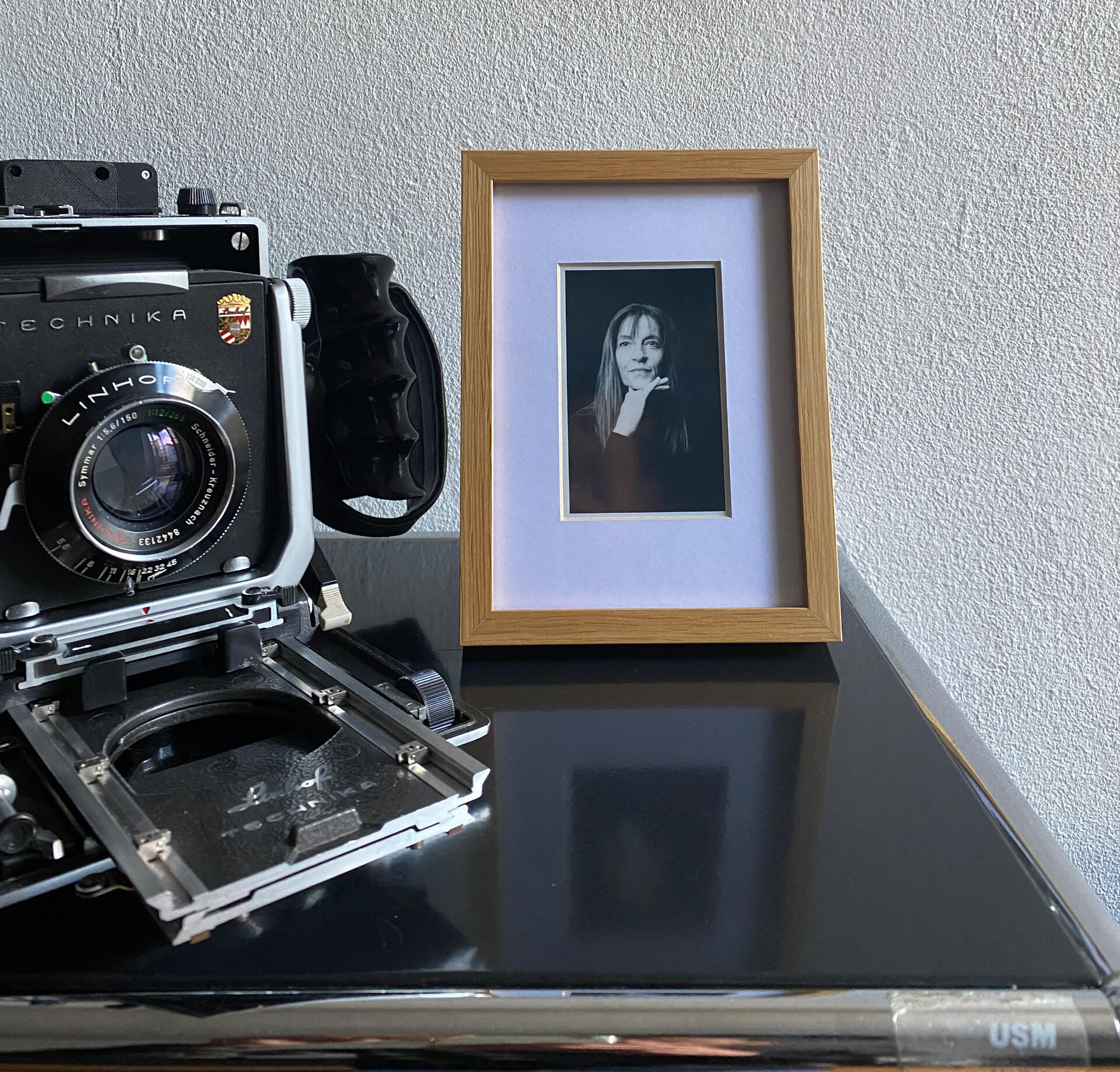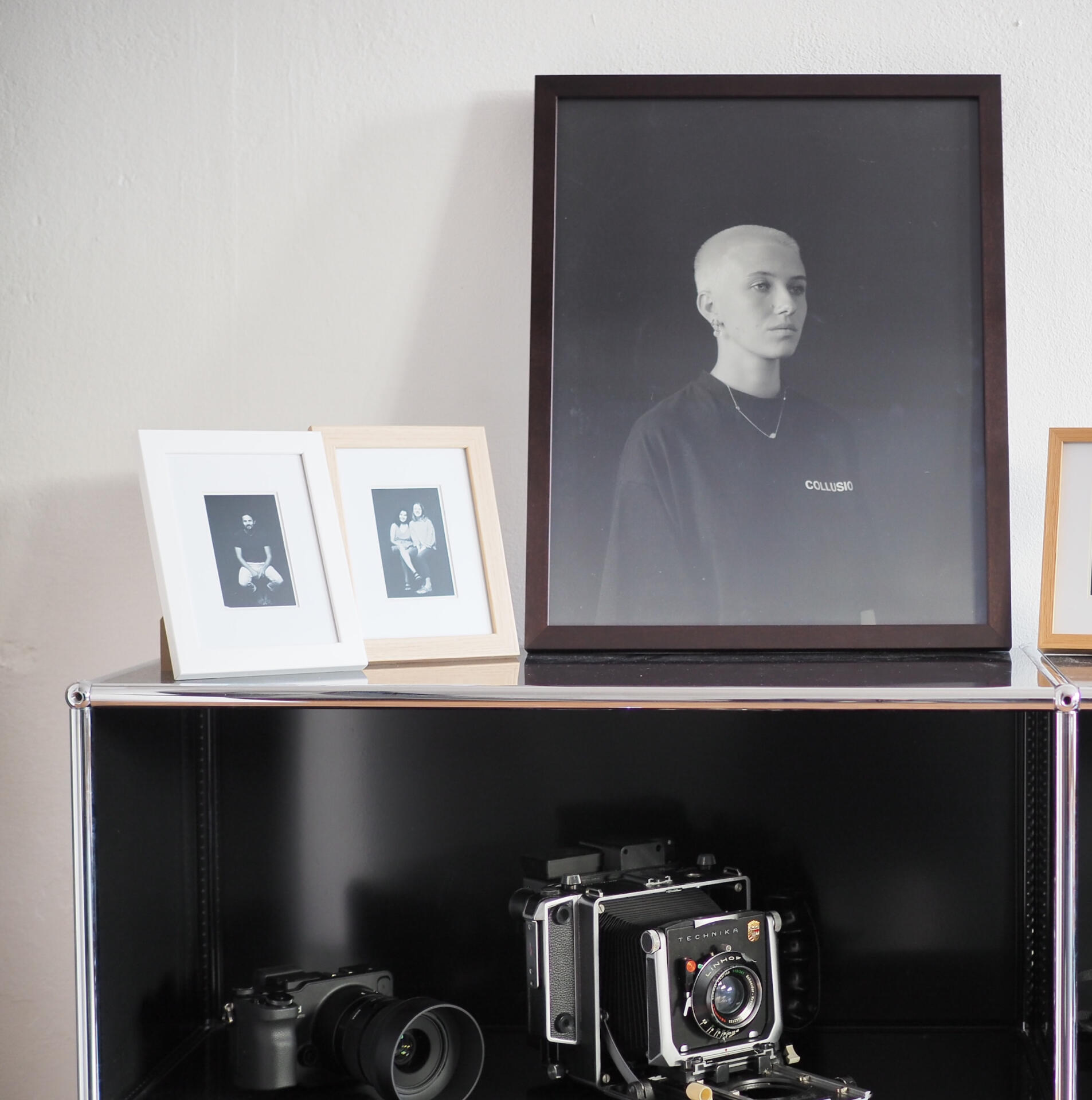 Séance en studio de quinze minutes sur film instantané, cadre Halbe 13x18cm avec passe-partout fait-main. Livraison de suite au studio.